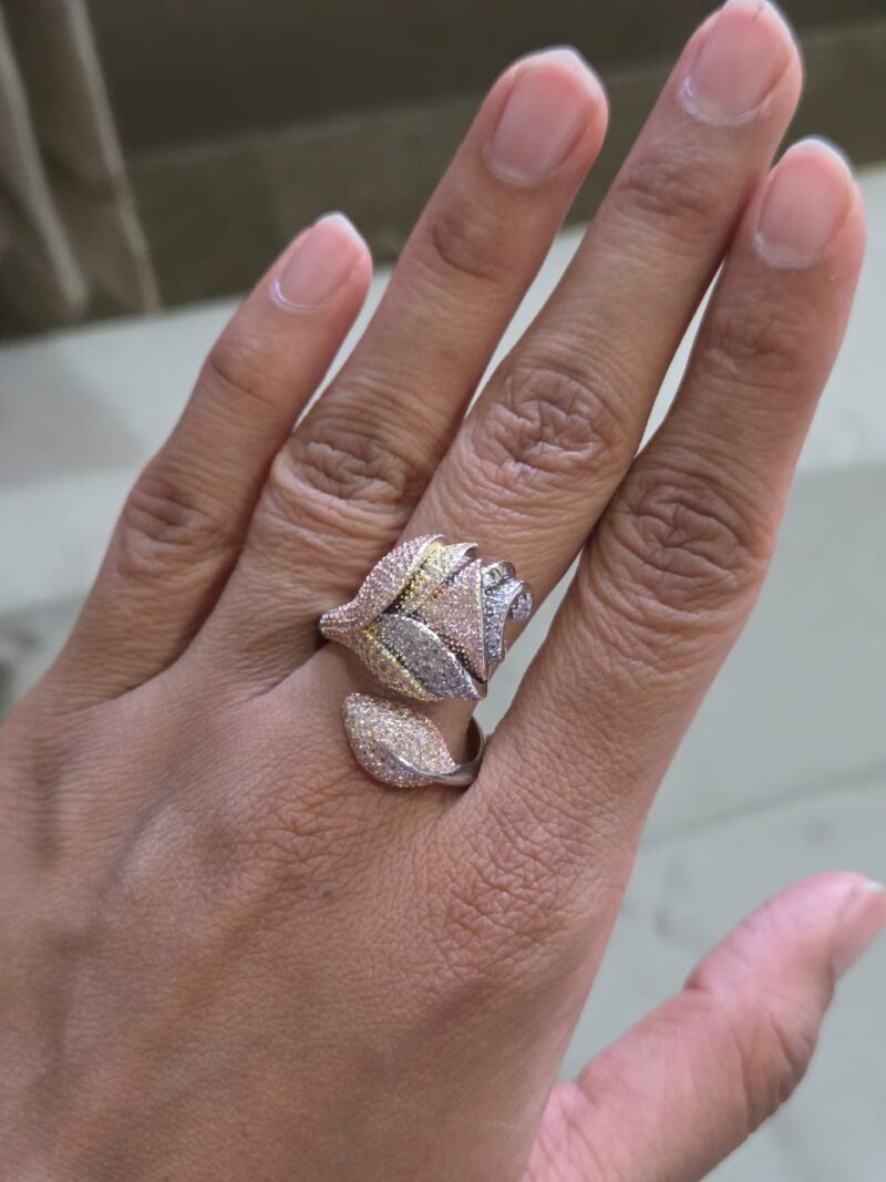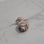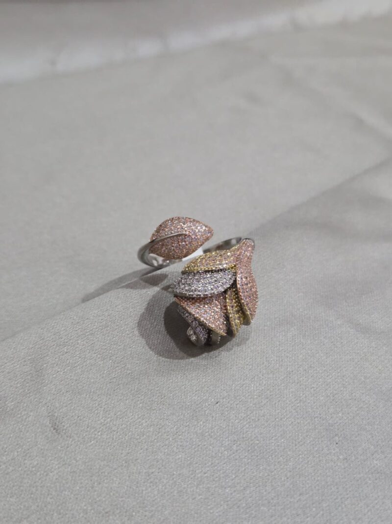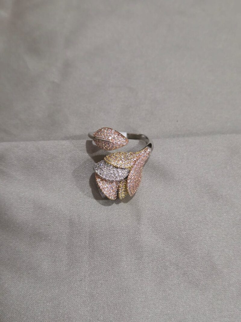 Experience the pinnacle of refined elegance with the Aura Petal Ring, a testament to exceptional craftsmanship and design. This exquisite piece, forged from luminous 925 sterling silver, captures the delicate, layered beauty of a blossoming flower. The ring’s sculptural form is lavishly adorned with a pavé of premium-grade cubic zirconia, each stone meticulously set to create a breathtaking mosaic of three-tone brilliance—a warm blush, a soft champagne, and a diamond-like white. Worn as a singular statement or a sophisticated accent, the Aura Petal Ring is not merely jewelry; it is a whisper of luxury, designed for the discerning individual who appreciates artistry and timeless allure.