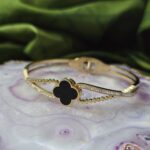 Centered with a deep black enamel clover, this bracelet is lined with crystal curves. Noir Bloom blends bold contrast with feminine elegance.