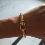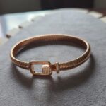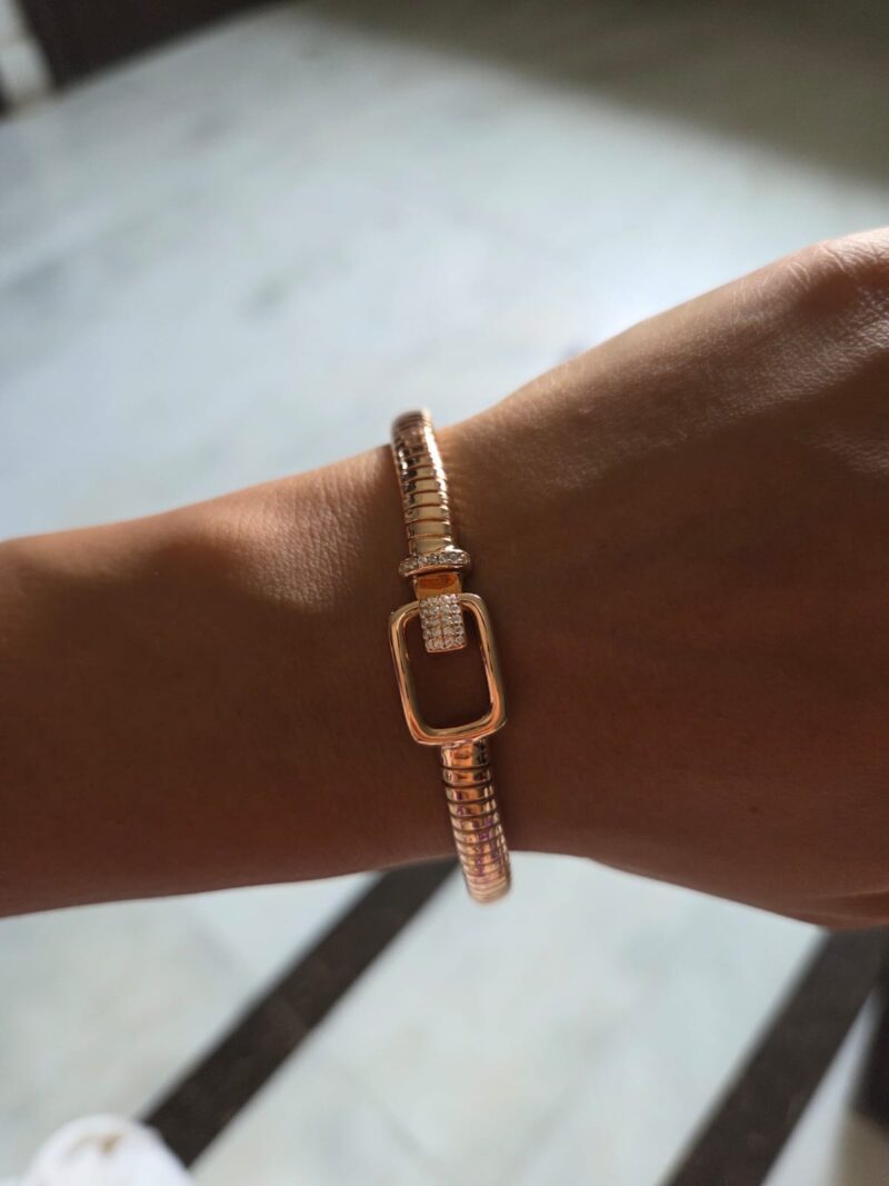 A refined statement of modern elegance, this 925 sterling silver bracelet plated in rose gold features a sleek, flexible band with a distinctive buckle-inspired clasp. Accented with delicate cubic zirconia detailing, it exudes understated luxury and contemporary charm. Perfect for elevating everyday style or complementing an evening look.