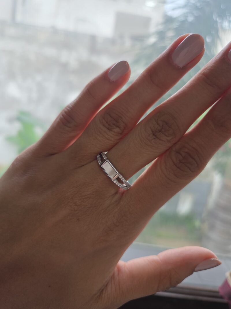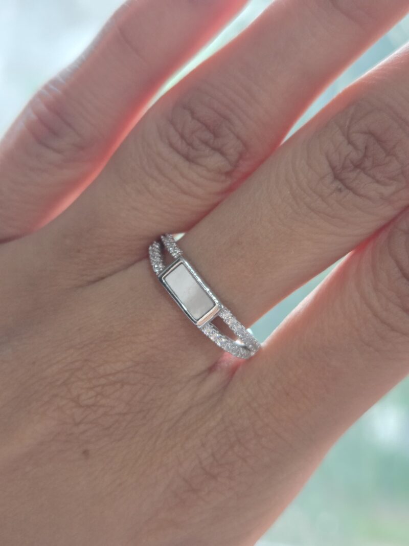 92.5 Sterling Silver Ring with Mother of Pearl & cubic zirconia in a sleek open design.