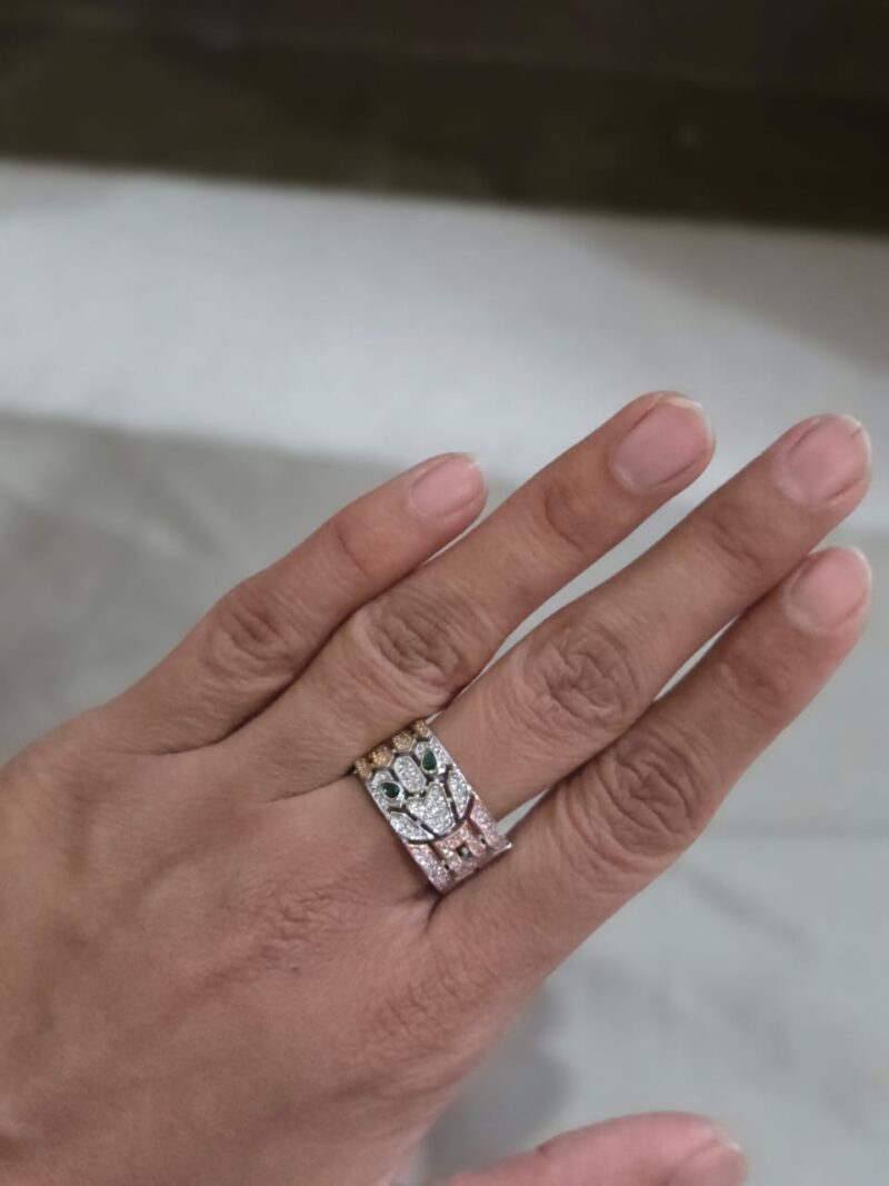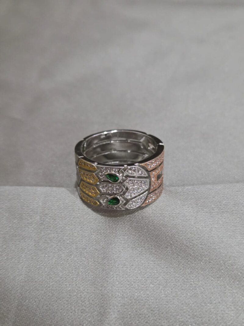 An opulent masterpiece in 925 sterling silver, the Regal Serpent Band captures the allure of timeless luxury. Adorned with pavé-set stones in radiant white, golden, and blush tones, its sculpted serpent-scale motif evokes strength and refinement. Two striking marquise-cut green stones add a touch of vivid brilliance, symbolizing vitality and elegance. A statement of grandeur and sophistication, this ring is crafted for those who command attention with effortless grace.