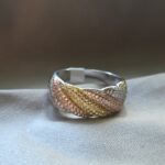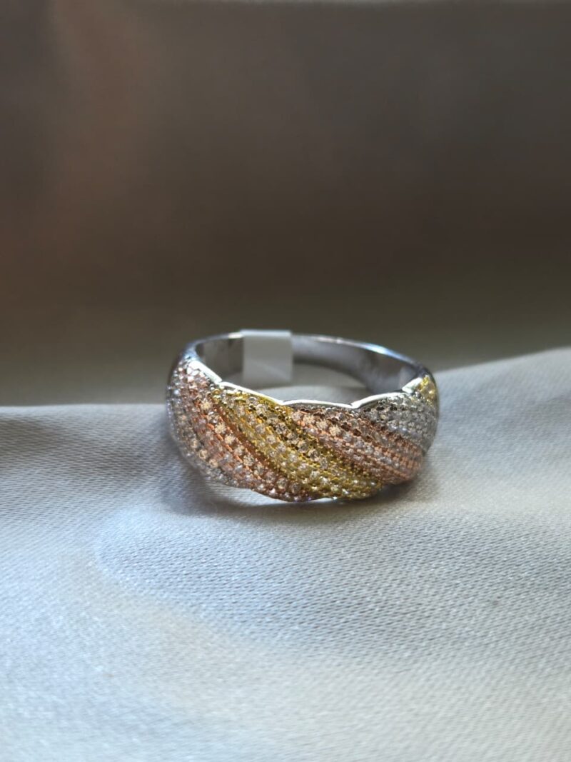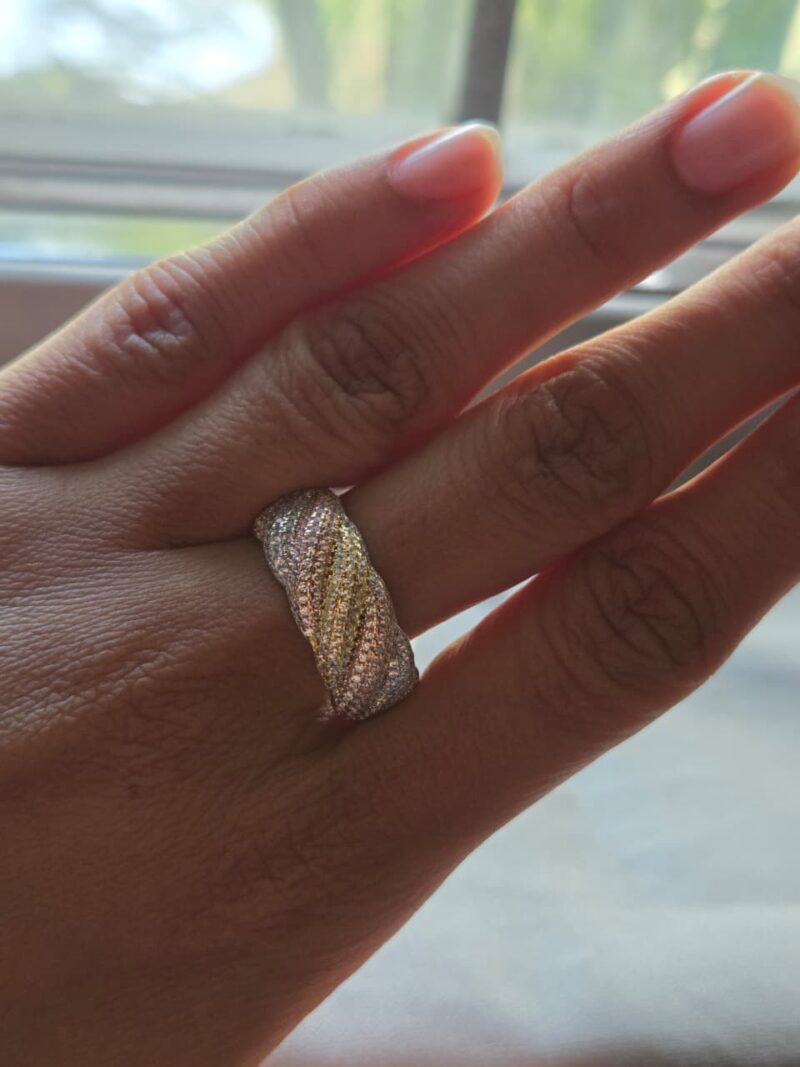 This exquisite ring features a wide, woven band design crafted from three distinct precious metals, each adorned with a shimmering pave of brilliant-cut diamonds. The intricate weave showcases a stunning trio of rose gold, yellow gold, and white gold, symbolizing a beautiful unity. The entire surface of the band is meticulously set with hundreds of sparkling diamonds, creating a breathtaking display of light and luxury. This unique and elegant piece is perfect for a special occasion or as a statement piece for everyday wear.