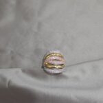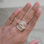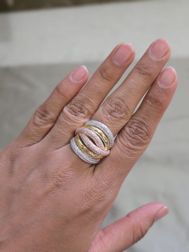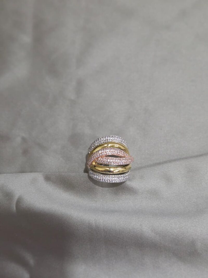 This stunning statement ring features a bold, interwoven design with three different metal tones. The bands are intricately set with brilliant pave-cut cubic zirconia stones, providing a dazzling, all-around sparkle. The mix of silver, gold, and rose-gold colored bands creates a unique and versatile piece that can be effortlessly styled with any jewelry collection. Perfect for special occasions or adding a touch of glamour to your everyday look, this ring is a true showstopper.